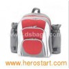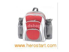 Picnic Cooler Backpack Material: 600D Polyester with silver laminate liner Size: 11-1/2 x 8 x 14.5 inches Features: 1)Insulated food compartment 2)Two detachable side wine bottle pockets 3)Two front pocket 4)Top carry handle 5)Padded shoulder straps and back for comfortable backpacking 6)Picnic sets for four persons Contents: 1)Four 9 inches melamine plates 2)Four sets of stainless steel knife, fork and spoon 3)Four plastic wine glasses and cotton napkins 4)One corkscrew and cheese knife 5)One plastic cutting board 6)One set of salt/pepper shakers.
