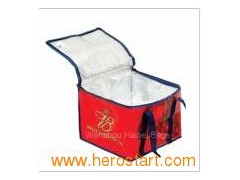 Cooler Bag Material: Outer: 600D polyester+ Inner: 2mm EPE foam laminated with Aluminium film. Size: (w)22x(h)13.5x(d)14.5 cm Logo printing on front panel Top Zipper closure