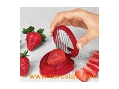 Strawberrry Slicer Cut beautiful, perfect strawberry slices in an instant! Handy kitchenhelper neatly and safely creates up to 8 even slices with one, quickdownward motion. Make attractive garnishes or toppings for cakes, sundaes, fruit salads or other desserts. Works on Kiwi fruit, too! Rinse-clean stainless steel blades. 3-3/4" x 2-3/4".