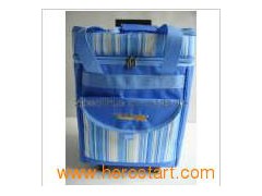 Trolley cooler bag with dual compartment/shoulder strap/side mesh pockets and front pocket Trolley Cooler bag with dual compartment/shoulder strap/side mesh pockets and front pocket 1. Prod Info. &Terms Material 600x300D polyester + PEVA insulation + 210D polyester lining Size 32.0*25.0*(46+4)(cm) Packing 1PC/polybag 2. Advantages 1). Designing: 6 designers, designed for Intercoop and Woolworths etc. And have our own brand. 2). Experience: 8 years experience in picnic bags, cooler bags, picnic rugs, trolley bag production. 3). Testing: All materials can pass test of AZO Free, Low Cadmium, LFGB Food Safety & FDA. 4). Factory Audit Certificate: BSCI and ISO9001 Sampling Time 1-2 weeks Shipment Time 35-45 days after confirmed order Payment Terms L/C at sight, or T/T 30% deposit against copy of B/L