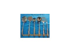 Kitchen wares(Kitchenware-05) Kitchen wares accessories include leak, flat shovel, macaroni holder, soup spoon, rice spoon and packing. 1. Product name: Kitchen wares 2. Item No: Kitchenware-05 3. Material: 100% stainless steel & ABS handle 4. Packing: Carton with each PCS in a plastic film, pastern bag or can be customized 5. MOQ: 1000SETS 6. Sample leadtime: Within three days 7. Mass production leadtime for MOQ qty: About 20 days after you confirm our samples 8. Logo: Laser 9. Payment term is 30% deposit, balance should be paid before shipment or against B/L draft by TT, Western Union, Paypal or L/C 10. Port: GuangZhou or ShenZhen or Customized Kitchen wares packing: We can pack it according to customer requirement or as the following form. High quality & best serve & Practical & Endurable ( Customized logo and design ) Kitchen wares can be used at home or outdoors or give away as business gift or do promotional advertisement We are professional manufacturer of hardware products. We will do our best to support your business Looking forward to establishing the long-time cooperation with you! NO. Thickness: (mm) Size: l*w(mm) Material Polish QTY/Carton Carton Size(cm) Net Weight 1. Leak 3.0mm/175g 360*112mm 430 Buren light 240pcs 55*45*55 42kg 2. Flat shovel 3.0mm/165g 360*100mm 430 Buren light 240pcs 55*50*40 40kg 3. Macaroni holder 3.0mm/125g 360*60mm 430 Buren light 240pcs 55*50*50 30kg 4. Soup spoon 3.0mm/155g 360*90mm 430 Buren light 240pcs 55*50*50 37kg 5. Rice spoon 3.0mm/140g 360*80mm 430 Buren light 240pcs 55*50*40 24kg 6. Packing 3.0mm/105g 360*76mm 430 Buren light 240pcs 45*40*40 25kg