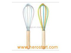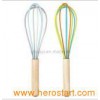 HYSK-0258 Silicone Whisk/ Egg beater Multi-coloured whisk features a mix of bright coloured silicone covered wires and a comfortable wooden handle. Silicone will not scratch non-stick pans, making it ideal for mixing sauces and mixtures. Size: L: 23 cm Dishwasher safe.