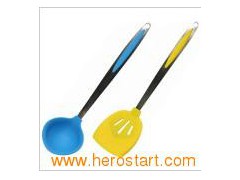 HYST-2125 2 Piece Silicone kitchen tool with S/S+TPR handle Include: Soup Ladle Slotted Truner Very resistant utensils Won't damage cookware; Won't melt or burn under high heat Resists to heat up to 240C Silicone handle provides a good grip.