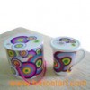 Porcelain mug with lid Material: Porcelain Top dia: 8.8cm Bottom dia.: 6.5cm Height: 10.2cm Packing: 1pcs in a giftbox, 24pcs in a carton Mini order: 3000pcs With 100% hand making nice and fashion gift box, fanshion and popular decal print on the mug, it is the best and popular gift.