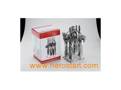 24PCS cutlery set with aluminum case MOQ: 1000sets Material: 410, 430 or 304 stainless steel Logo: Laser Sample leadtime: About 3 days Mass prodcution leadtime: About 30 days. Blister card, PVC box, gift box, wood box packing are avaliable Customized packing is acceptable. Pls contact us for more information!