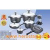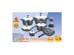 Material: Aluminum Alloy Handle: Long handle is bakelite handle Lid: Semi s/s lid & semi glass lid Knob: S/s knob Coating: Inside 16.7.5cm sauce pan with lid 24*11.5cm casserole with lid 28*12.5cm casserole with lid 32*14.5cm Casserole with lid 32*7.5cm double grill pan 28*5.0cm round fry pan with lid 7PCS cooking tools 1PC apron + 2PCS handle protectors