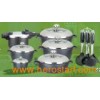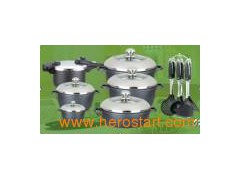Material: Aluminum Alloy Handle: Long handle is bakelite handle Lid: Semi s/s lid & semi glass lid Knob: S/s knob Coating: Inside 16*7.5cm casserole with lid 24*11.5cm Casserole with lid 28*12.5cm Casserole with lid 32*14.5cm Casserole with lid 28*7.5cm shallow casserole with lid 6L pressure cooker 7PCS cooking tools