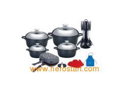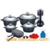 Material: Aluminum Alloy Handle: Long handle is bakelite handle Lid: Semi s/s lid & semi glass lid Knob: S/s knob Coating: Inside 16*7.5cm casserole with lid 20*8.5cm casserole with lid 24*11.5cm casserole with lid 28*12.5cm casserole with lid 32*7.5cm double grill pan 2PCS hand protectors 2PCS glove 1PC apron 7PCS cooking tools