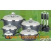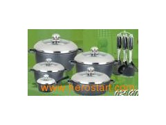 Material: Aluminum Alloy Handle: Long handle is bakelite handle Lid: Semi s/s lid & semi glass lid Knob: S/s knob Coating: Inside 16.7.5cm sauce pan with lid 20*8.5cm casserole with lid 24*11.5cm casserole with lid 28*12.5cm casserole with lid 24*6.0cm deep fry pan with lid 1PC apron 2PCS silicone handle