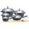 Material: Aluminum Alloy Handle: Long handle is bakelite handle Lid: Semi s/s lid & semi glass lid Knob: S/s knob Coating: Inside 16.7.5cm sauce pan with lid 20*8.5cm casserole with lid 24*11.5cm casserole with lid 28*12.5cm casserole with lid 24*6.0cm deep fry pan with lid 1PC apron 2PCS silicone handle