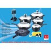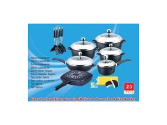 Material: Aluminum Alloy Handle: Long handle is bakelite handle Lid: Semi s/s lid & semi glass lid Knob: S/s knob Coating: Inside 16*7.5cm Sauce pan with lid 20*8.5cm Casserole with lid 24*11.5cm Casserole with lid 28*12.5cm Casserole with lid 32*7.5cm double grill pan 28*6.5cm deep fry pan with lid 7PCS cooking tools 2PCS gloves 1PC apron+2PCS handle protectors