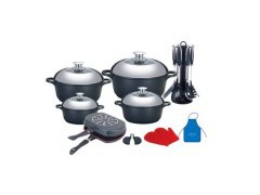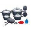Material: Aluminum Alloy Handle: Long handle is bakelite handle Lid: Semi s/s lid & semi glass lid Knob: S/s knob Coating: Inside 16*7.5cm casserole with lid 20*8.5cm casserole with lid 24*11.5cm casserole with lid 28*12.5cm casserole with lid 32*7.5cm double grill pan 2PCS hand protectors 2PCS glove 1PC apron 7PCS cooking tools