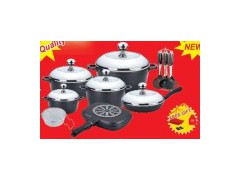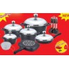 Material: Aluminum Alloy Handle: Long handle is bakelite handle Lid: Semi s/s lid & semi glass lid Knob: S/s knob Coating: Inside 20*8.5cm Casserole with lid 28*12.5cm Casserole with lid 32*14.5cm Casserole with lid 24*16.5cm stock pot with lid 32*7.5cm double grill pan 24*4.5cm fry pan 20cm basket 7PCS cooking tools 2PCS gloves 1PC apron+2PCS handle protectors