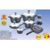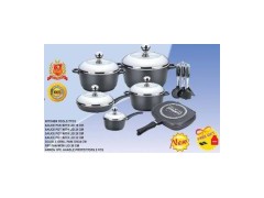 Material: Aluminum Alloy Handle: Long handle is bakelite handle Lid: Semi s/s lid & semi glass lid Knob: S/s knob Coating: Inside 16.7.5cm sauce pan with lid 24*11.5cm casserole with lid 28*12.5cm casserole with lid 32*14.5cm Casserole with lid 32*7.5cm double grill pan 28*5.0cm round fry pan with lid 7PCS cooking tools 1PC apron + 2PCS handle protectors