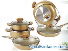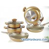 10pcs set: Inside:Golden non-stick coating; Outside:Heat-resistant paint; Accessories:Bakelite insert with steel handle,ear and knob, all sprayed with colorful paint; Bottom:Spiral base