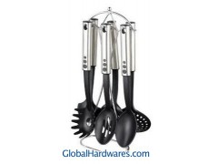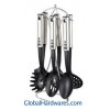 Set includes: one for each soup ladle, skimmer, slotted turner, spoon,slotted spoon, spaghetti server and stand. Material: 201 stainless steel handle + nylon. Heat resistance up to 210°C, With SGS, FDA and LFGB food testing marks. Different handles and colors are available.