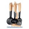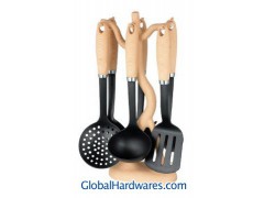 Set includes: one for each soup ladle, skimmer, slotted turner, spoon,slotted spoon, spaghetti server and stand. Material: ABS (wooden color) handle + nylon. Heat resistance up to 210°C, With SGS, FDA and LFGB food testing marks. Different handles and colors are available.