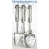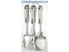 Set includes: one for each soup ladle, skimmer, fork, slotted turner, spoon, spaghetti server and stand. Material: 201 stainless steel handle + 18/0 stainless steel. With SGS, FDA and LFGB food testing marks. Different handles and colors are available.