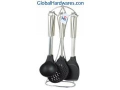Set includes: soup ladle, skimmer, turner, slotted turner, spoon, slotted spoon and stand. Material: 201 stainless steel handle + 18/0 stainless steel and nylon. Heat resistance up to 210°C, With SGS, FDA and LFGB food testing marks. Different handles and colors are available.