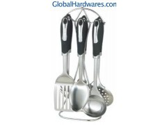 Set includes: one for each soup ladle, skimmer, fork, slotted turner, spoon, spaghetti server and stand. Material: ABS (with rubber finish) handle + 18/0 stainless steel. With SGS, FDA and LFGB food testing marks. Different handles and colors are available.