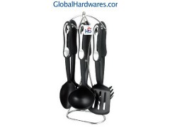 Set includes: one for each soup ladle, skimmer, slotted turner, spoon,slotted spoon, spaghetti server and stand. Material: ABS (with rubber finish) handle + nylon. Heat resistance up to 210°C, With SGS, FDA and LFGB food testing marks. Different handles and colors are available.