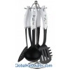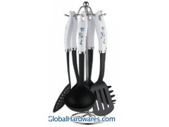 Set includes: one for each soup ladle, skimmer, slotted turner, spoon,slotted spoon, spaghetti server and stand. Material: ABS (flower printed) handle + nylon. Heat resistance up to 210°C, With SGS, FDA and LFGB food testing marks. Different handles and colors are available.