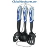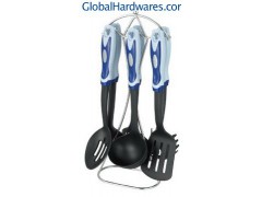 Set includes: one for each soup ladle, skimmer, slotted turner, spoon,slotted spoon, spaghetti server and stand. Material: ABS handle + nylon. Heat resistance up to 210°C, With SGS, FDA and LFGB food testing marks. Different handles and colors are available.