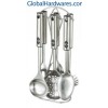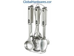 Set includes: one for each soup ladle, skimmer, fork, slotted turner, spoon, spaghetti server and stand. Material: 201 stainless steel handle + 18/0 stainless steel. With SGS, FDA and LFGB food testing marks. Different handles and colors are available.