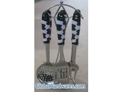 Set includes: one for each soup ladle, skimmer, fork, slotted turner, spoon, spaghetti server and stand. Material: ABS handle + 18/0 stainless steel. With SGS, FDA and LFGB food testing marks. Different handles and colors are available.