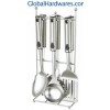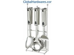 Set includes: one for each soup ladle, skimmer, fork, slotted turner, spoon, spaghetti server and stand. Material: 201 stainless steel handle + 18/0 stainless steel. With SGS, FDA and LFGB food testing marks. Different handles and colors are available.