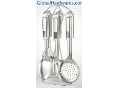 Set includes: one for each soup ladle, skimmer, fork, slotted turner, spoon, spaghetti server and stand. Material: 201 stainless steel handle + 18/0 stainless steel. With SGS, FDA and LFGB food testing marks. Different handles and colors are available.