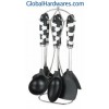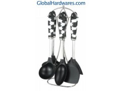 Set includes: soup ladle, skimmer, turner, slotted turner, spoon, slotted spoon and stand. Material: ABS handle + 18/0 stainless steel and nylon. Heat resistance up to 210°C, With SGS, FDA and LFGB food testing marks. Different handles and colors are available.