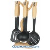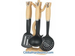 Set includes: one for each soup ladle, skimmer, slotted turner, spoon,slotted spoon, spaghetti server and stand. Material: ABS (wooden color) handle + nylon. Heat resistance up to 210°C, With SGS, FDA and LFGB food testing marks. Different handles and colors are available.