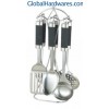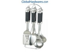Set includes: one for each soup ladle, skimmer, fork, slotted turner, spoon, spaghetti server and stand. Material: ABS (with rubber finish) handle + 18/0 stainless steel. With SGS, FDA and LFGB food testing marks. Different handles and colors are available.