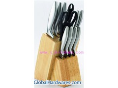 Material:3CR13 8"CHEF: 3.0mm 8"BREAD: 3.0mm 8"CARVING:3.0mm 5"UTILITY:2.0mm 3.5"PARING:2.0mm 4.5"STEAK:2.0mm 8"KITCHEN SCISSORS:2.0mm 8"SHARPENER:9.0mm WOOD BLOCK: 21.5cm*16.7cm*17.5cm Measure: 55cm*36cm*37.6cm N.W/G.W: 11.35kg / 12.35kg