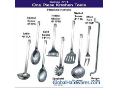 ----Consists of ladle, slotted spoon, spaghetti server, skimmer, potato masher, slotted turner, meat fork & hanger -----made of high quality 18/10 stainless steel -----hooked handle