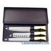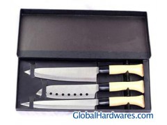 3 PCS Kitchen knife set. Used 3Cr13 stainless steel for blade, Plastic handle with wooden color. details:Blade: Stainless steel (3Cr13), Handle: Plastic (PP), and coating of wood grain,very nice, Total 3 PCS,cleaver knife,chef knife,slicer knife,tray. Packed:1set/gift box,24sets/Ctn,37.5*38.5*35.5cm.