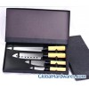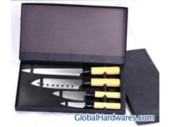 4 PCS Kitchen knife set. Used 3Cr13 stainless steel for blade, Plastic handle with wooden color. details:Blade: Stainless steel (3Cr13), Handle: Plastic (PP), and coating of wood grain,very nice, Total 4 PCS,chef knife,slicer knife,paring knife,utility,tray. Packed:1set/gift box,24sets/Ctn,40.5*38.5*35.5cm.