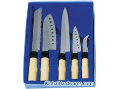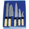 5 PCS Kitchen knife set. Used 3Cr13 stainless steel for blade, Plastic handle with wooden color. details:Blade: Stainless steel (3Cr13), Handle: Plastic (PP), and coating of wood grain,very nice, Total 5 PCS,cleaver knife,chef knife,bread knife,slicer knife,utility,tray. Packed:1set/gift box,24sets/Ctn,46.5*38.5*35.5cm.