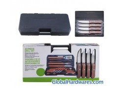 23pcs BBQ tool set,Materials:stainless steel with wooden handle,Thickness of product:1.5mm/pc. Set includes: spatula:53cm,fork:51cm,tong:48cm,fur brush:47cm,copper brush:47.5cm,long skewer:50cm,knife:54cm,corn holder:7cm,steak knife:24.5cm,1 set come with carrying plastic case. our advantage 1. High quality & good price,more quantity, the more reasonable price. 2. Client’s logo is welcome. 3. Can be used for sales,promotion & household