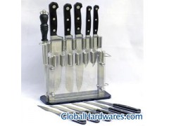 13pcs kitchen knife set,includes*8"chef's knife *8"carving knife *8"bread knife *5"utility knife *3-1/2"paring knife *sharper*6pcs 4-1/2"steak knives *holder,Single forged handle with ABS plastic ,knife is made of 2Cr13 stainless steel.