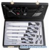 12-piece Kitchen Knife Set with Leather case. Materials: 2CR13 and high-quality stainless steel.Specifications:Peeling knife 3.5 inches and thickness with 1.5mm,Utility knife 5 inches and thickness with 1.5mm,Fork &boning knife 6 inches and thickness with 2.0mm,Carving knife 7 inches and thickness with 2.0mm,Bread knife 8 inches and thickness with 2.0mm,Serving knife 9 inches and thickness with 2.0mm,Chef's knife 9 inches and thickness with 2.0mm,Chopper knife and thickness with 2.5mm,sharper 7 inches and thickness with 7.0mm,Kitchen scissors &thickness with 2.5mm,Poultry shears &thickness with 3.0mm, Polish,Packing details:4sets per carton. Size: 46 x 40 x 36cm.