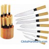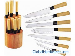 11 PCS Kitchen knife set with wooden stand/block/holder. Used 3Cr13 stainless steel for blade, Plastic handle with wooden color. details:Blade: Stainless steel (3Cr13), Handle: Plastic (PP), and coating of wood grain,very nice, Total 12 PCS,cleaver knife,chef knife,bread knife,slicer knife,paring knife,utility,wood holder. Packed:1set/gift box,6sets/Ctn,46.5*39*35.5cm.