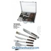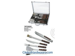 6pcs BBQ Tool Set Material: 2cr13 stainless steel, color wood handles, aluminum case Product specifications: Spatulax 1: 44cm Fork x 1: 44cm Tongs x 1: 44cm Knife x 1:46.5cm Basting brush x 1:44.5cm Wire brush x 1:43cm Packing: 1set/aluminum case 47.5*35.5*5.5cm