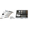 5pcs BBQ Tool Set, Aluminum Case Packing Material: 2Cr13 stainless steel, ss/rubber wood handles Product specifications: Spatula x 1: 42.5cm BBQ fork x 1: 42.5cm Tongs x 1: 42.5cm Basting brush x 1: 41.5cm Brass brush x 1: 43cm Thickness of above: 1.5mm Packing: all tools are in an aluminum case 47*16.5*7.2cm