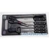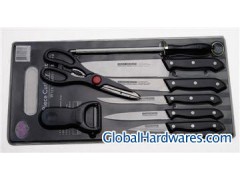 9pcs kitchen knife set,includes:Chef's knife,8"(20.3cm),thickness:1.2mm; slicer knife,8"(20.3cm),thickness:1.2mm;bone knife,5-1/2"(14cm),thickness:1.0mm,;Utility knife,4-1/2"(11.5cm),thickness:1.0mm;Paring knife,3"(7.5cm),thickness:1.0mm;sharpener,7-1/2",dia.:8mm;scissors;peeler;cutting board,29*19cm;material:2Cr13 stainless steel,PP handle.the type of connect the edge to the handle:insert.