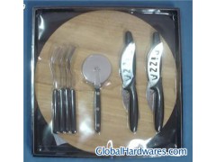 10pcs pizza knife set,made of 18/0 stainless steel,with big wooden plate,practical and best price! includes:4pcs pizza knives,1.2mm,4pcs pizza fork,1.5mm,1pc pizza cutter,6cm dia cutter,material of handle: PP,material of blade: 2cr13 s/s,size of wood cutting board: 30cm dia x 1.5cm. *perfect function.*food standard.*dishwasher safe.Packaging Detail: each set into one bubble bag,whole set into color box. meast.:32x32x38cm 8sets/ctn G.W.14KGS