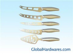 5pcs cheese knives set,Hot promotion item. The Cheese Knife is made of the high quality S.S.420&S.S.430;Handle style:Hollow inside; 5pcs cheese knives set including :1pc pizza knife with holes,1pc cheese knife with holes,1pc tomato knife,1pc cheese knife,1pc gateau knife.different packaging, 1) Blister card, 2) Gift Box, 3) Window Box, 4) Each set into colour box, 5) PVC transparent box, and other packing method as your like.