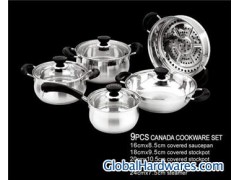 Product:CANADA COOKWARE SET 9 PCS Item NO:SF-Y0806 Material:S/S #201 Thickness:0.4mm Specification: 16CM*8.5CM covered saucepan 18CM*9.5CM covered stockpot 20CM*10.5CM covered stockpot 24CM*7CM hot pot 24CM*7.5CM steamer Description: 2.4mm capsule bottom(0.4mm body+1.5mm Al+0.5mm protector) Belly shape,step roll edge, Mirror polish inside and sand polish outside, Riveted bakelite handle and knob, clear glass lid, Induction oven available,Dishwasher Safe