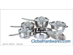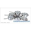 10 piece stainless steel cookware set 16x8.5cm saucepan w/lid 18x9.5cm saucepan w/lid 20x10.5cm saucepan w/lid 20x10.5cm saucepot w/lid 24x5.5cm frypan w/helper w/lid 0.6mm 18/8 s/s body 2.5mm alu. Capsuled bottom conical shape fold edge hollow handle and knob 0.6mm 18/8 s/s flat lid satin polish outside and mirror polish inside